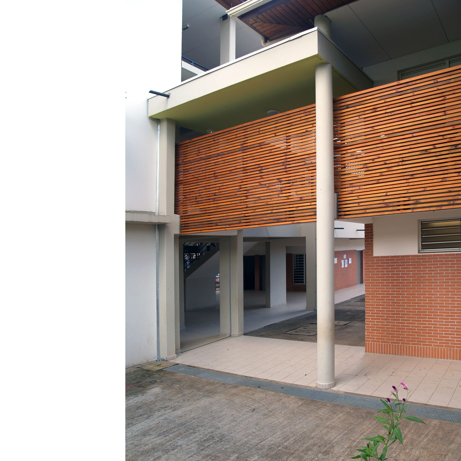 Le hall d’accueil est à l’articulation entre les bâtiments, et en liaison avec les circulations et les espaces extérieurs. Les circulations verticales et les coursives composent les façades sur cour de l’école.