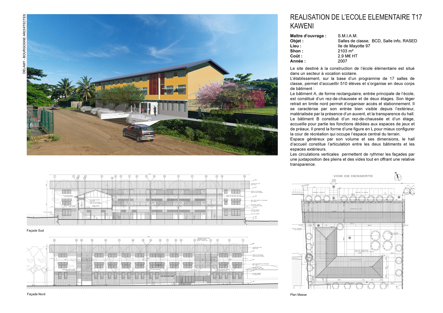 mission Base loi MOP | type construction neuve | maître d’ouvrage SMIAM | maître d’œuvre Charles Delamy architecte mandataire | livraison 2011 | surface 2.103m² | budget 3,78M€ | lieu Kaweni, Mayotte (976)