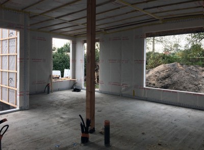 Chantier de construction d’une villa en ossature bois au Teich, en bordure du bassin d’Arcachon. Le montage de l’enveloppe extérieure de la construction a été réalisé en deux jours, assurant ainsi rapidement le clos et le couvert du volume bâti.