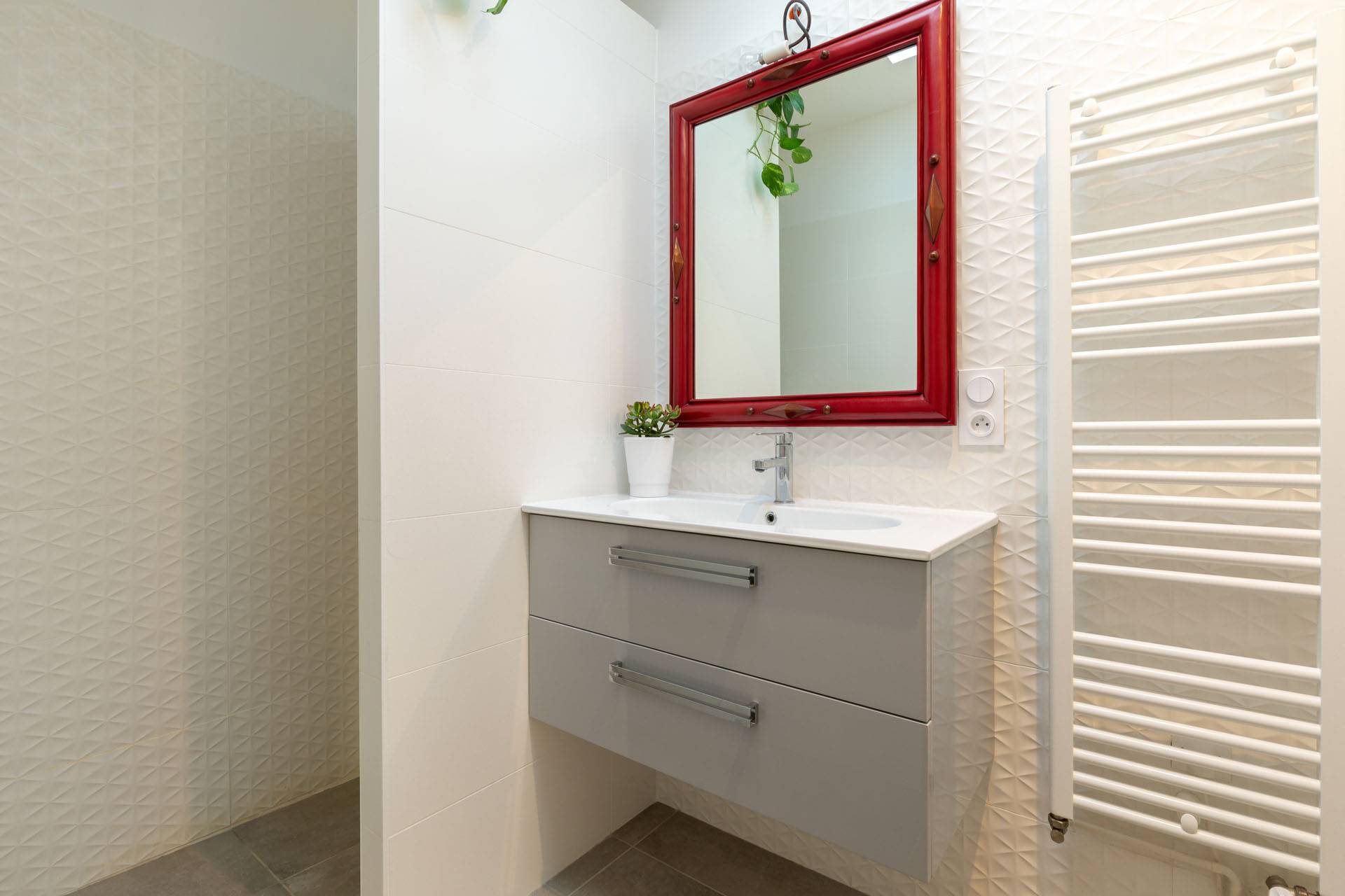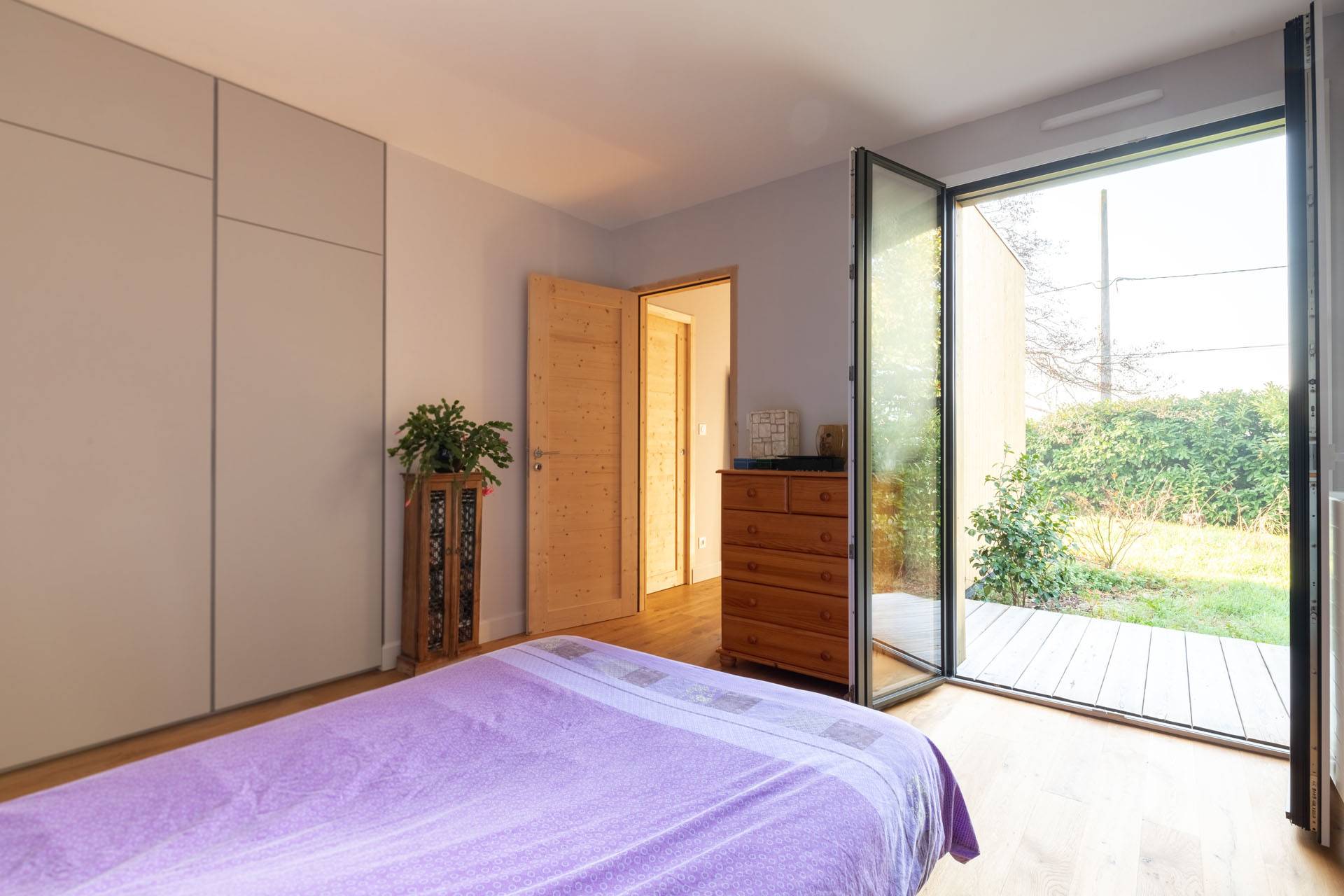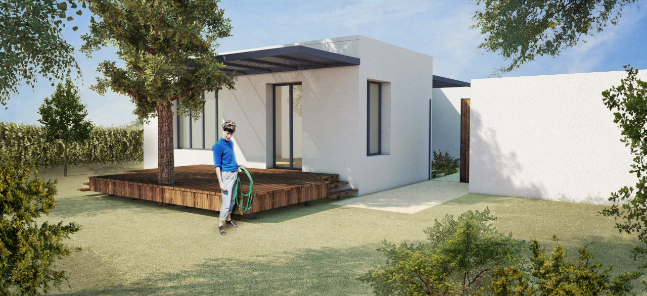 La villa, posée en limite de propriété côté Nord, tourne le dos au voisinage. Ses façades Sud et Est s’ouvrent sur le jardin, se protégeant des intempéries de l’Ouest. Tout à la fois simple par ses formes, raffinée par le choix des matériaux (menuiseries extérieures gris moyen, murs intérieurs blancs, faïences lisses ou texturées blanches), extrêmement lumineuse grâce aux baies vitrées, et à l’ouverture zénithale pratiquée dans la salle de bain, cette maison moderne se prolonge hors les murs grâce à des terrasses en bois.Les espaces de la maison - composée de trois pièces principales - sont donc définis par des volumes décalés et des points de vue variés sur le jardin.