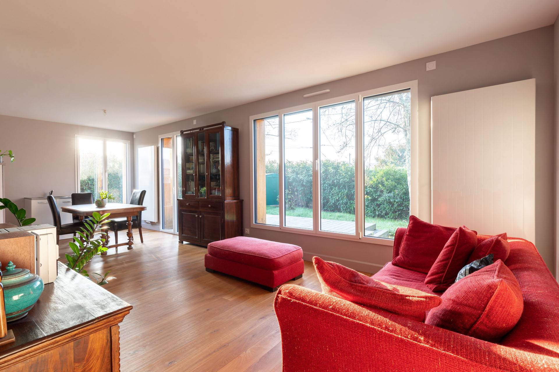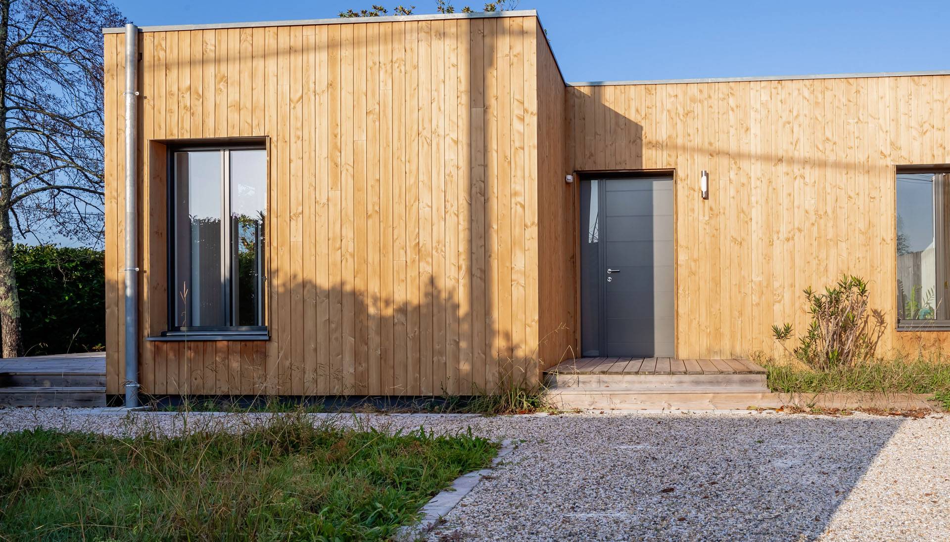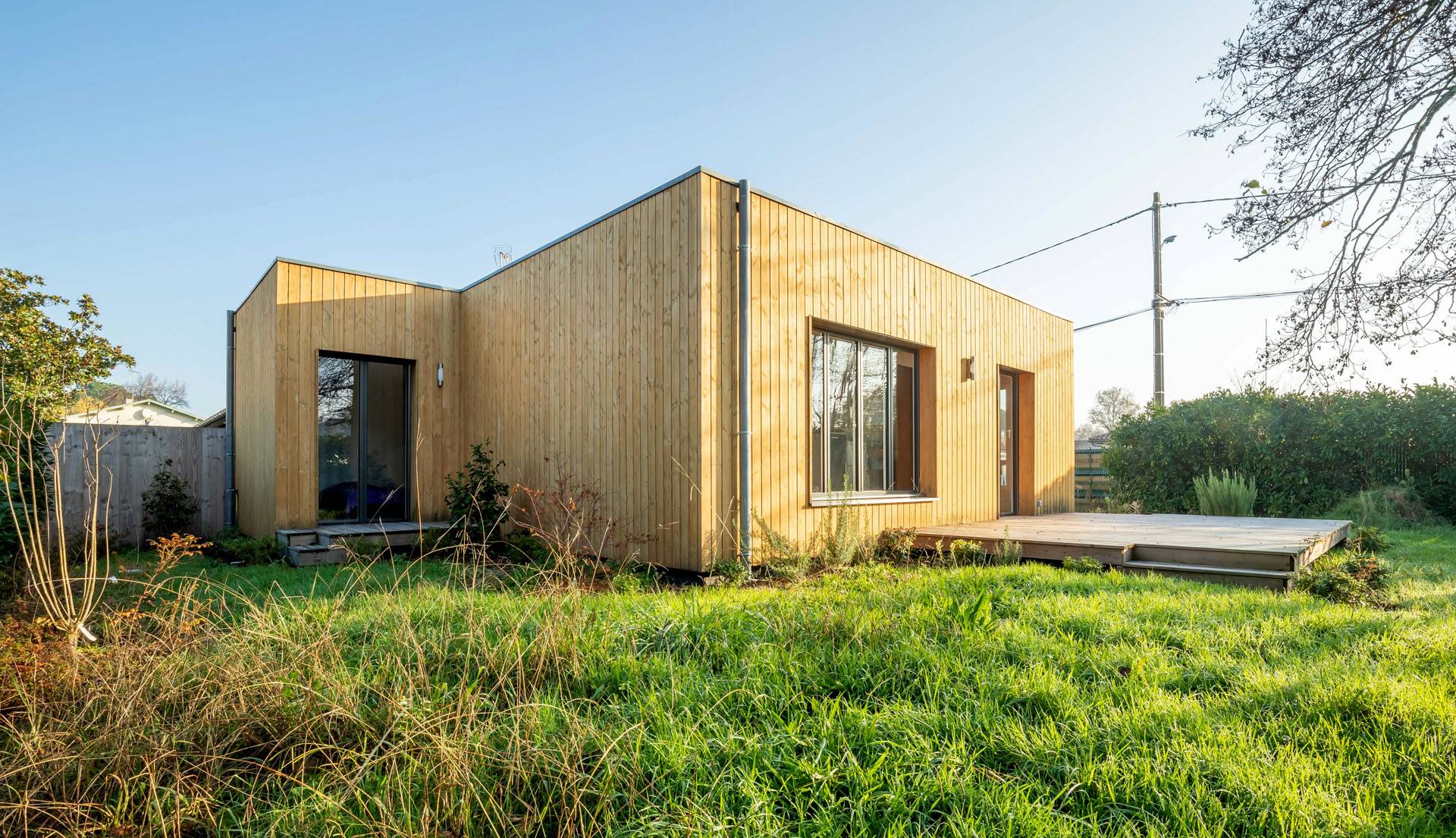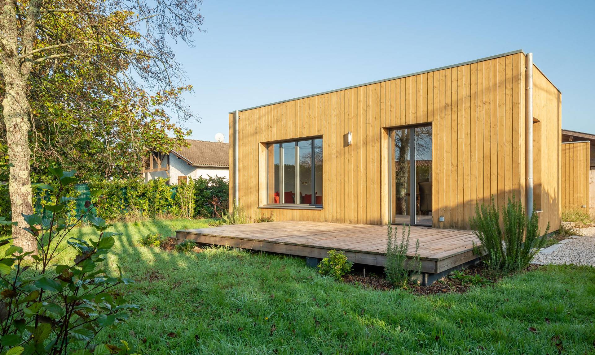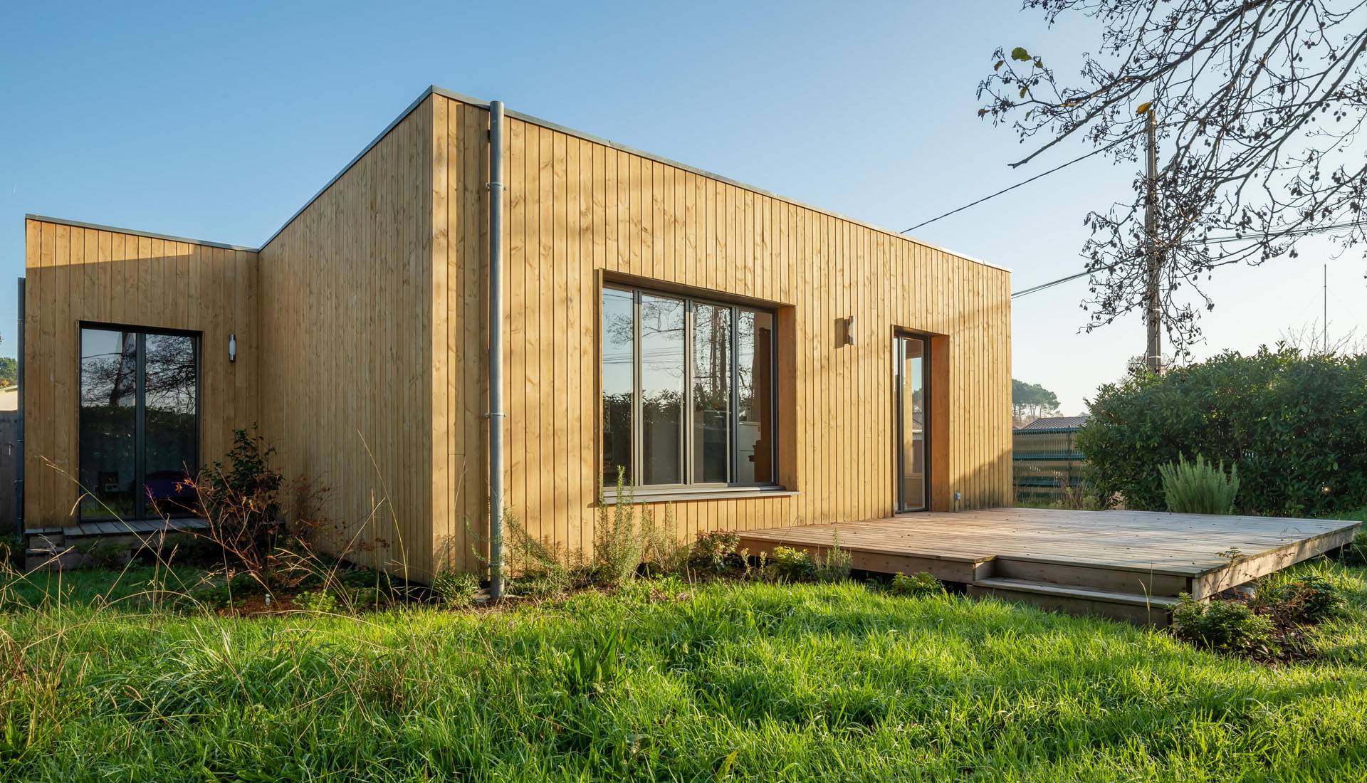 Le choix s’est porté sur une construction en ossature bois posée sur dalle béton, respectant les normes RT 2012. Deux cubes habillés d’un bardage bois, couleur miel, sont couverts d’une toiture terrasse avec étanchéité par membrane. Ils abritent deux espaces : jour et nuit. L’habitation est chauffée au gaz de ville, par une chaudière à condensation et des radiateurs.