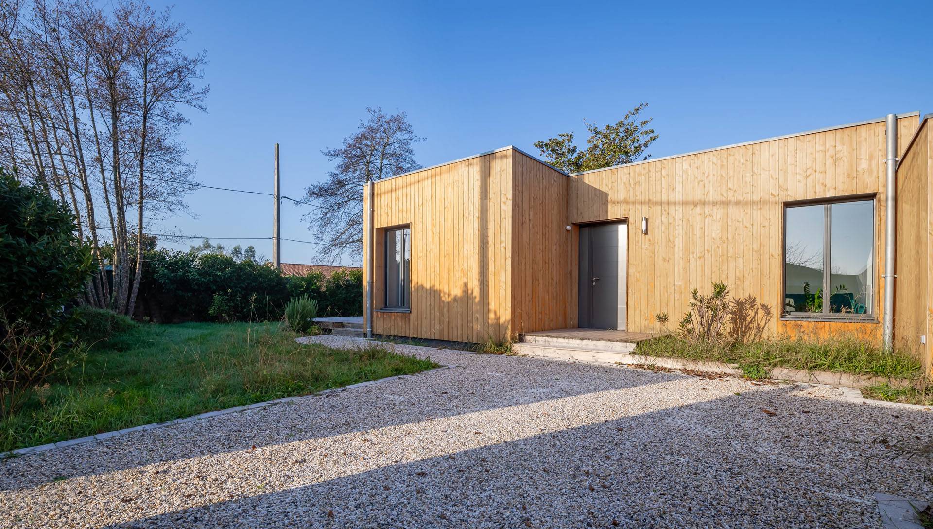 En bordure du Bassin d’Arcachon, sur la commune de Le Teich, construction d’une villa neuve au sein d’un quartier verdoyant, sur un petit terrain largement planté d’arbres.