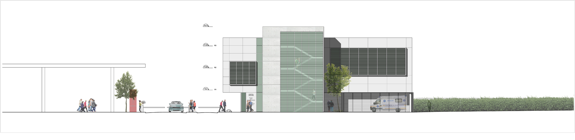 Le bâtiment d’architecture contemporaine marque l’entrée de l’hôpital et accompagne vers les diverses unités de cet établissement de santé.