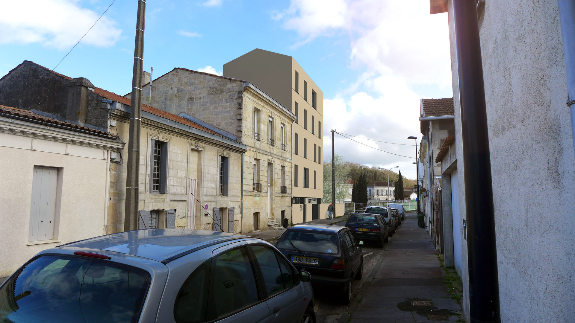 Dans ce quartier d’échoppes nous proposons une construction en enduit ton pierre. Des joints creux horizontaux structurent la façade sur sa hauteur. Les menuiseries sont en aluminium laqué gris foncé, tous les logements sont largement vitrés et profitent au minimum d’une double exposition. La toiture à deux pentes ne présente aucun débord : les chéneaux sont encastrés pour des lignes simples et contemporaines.