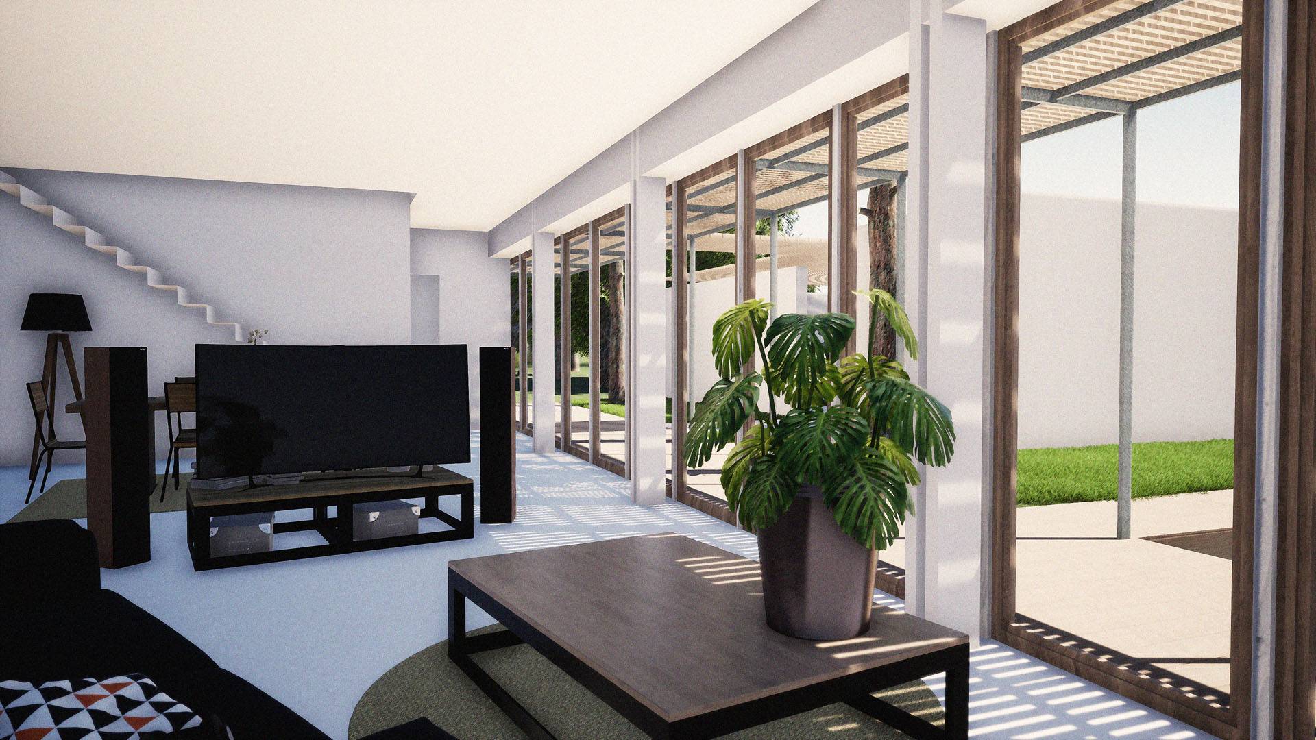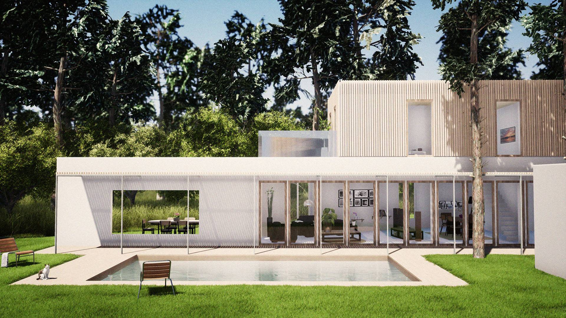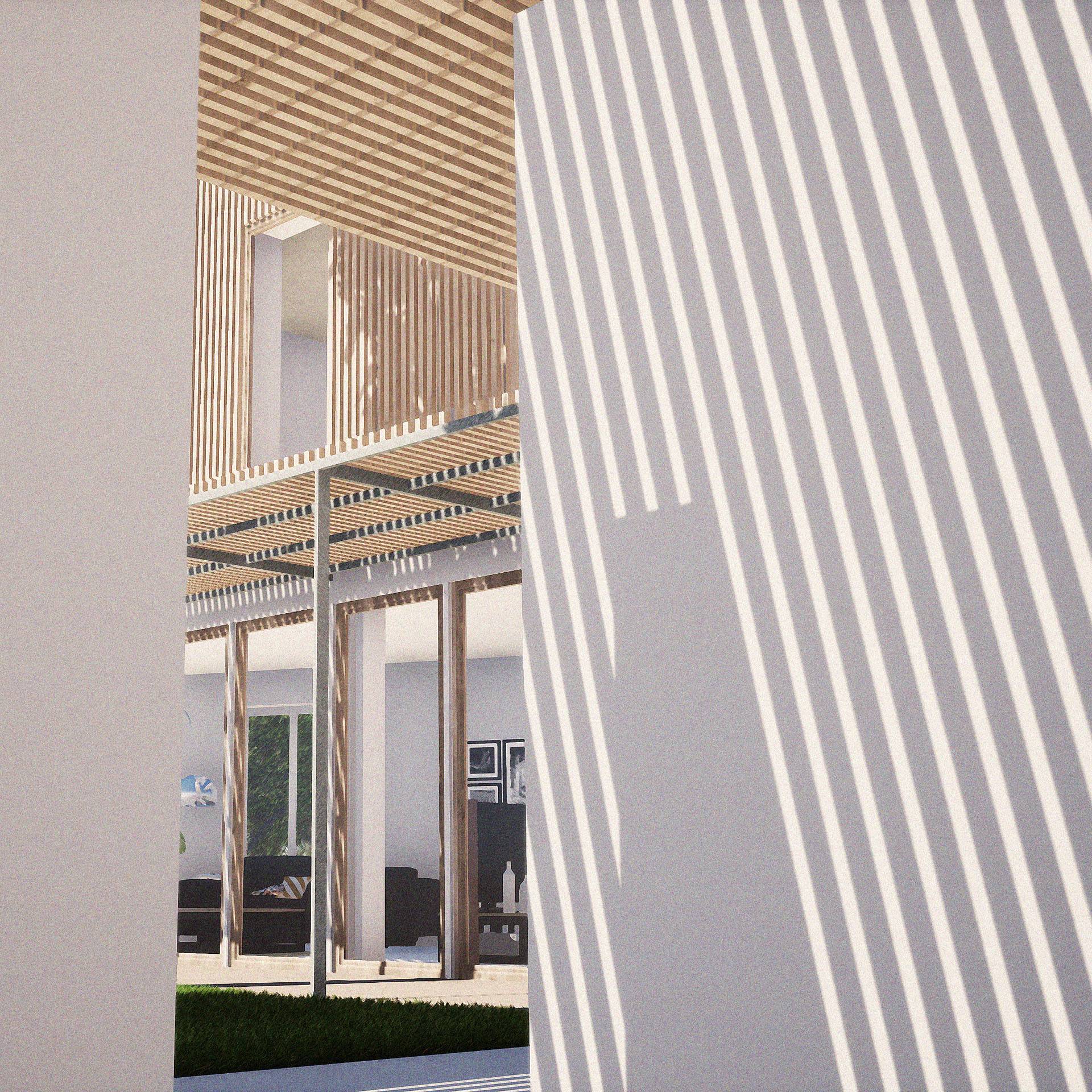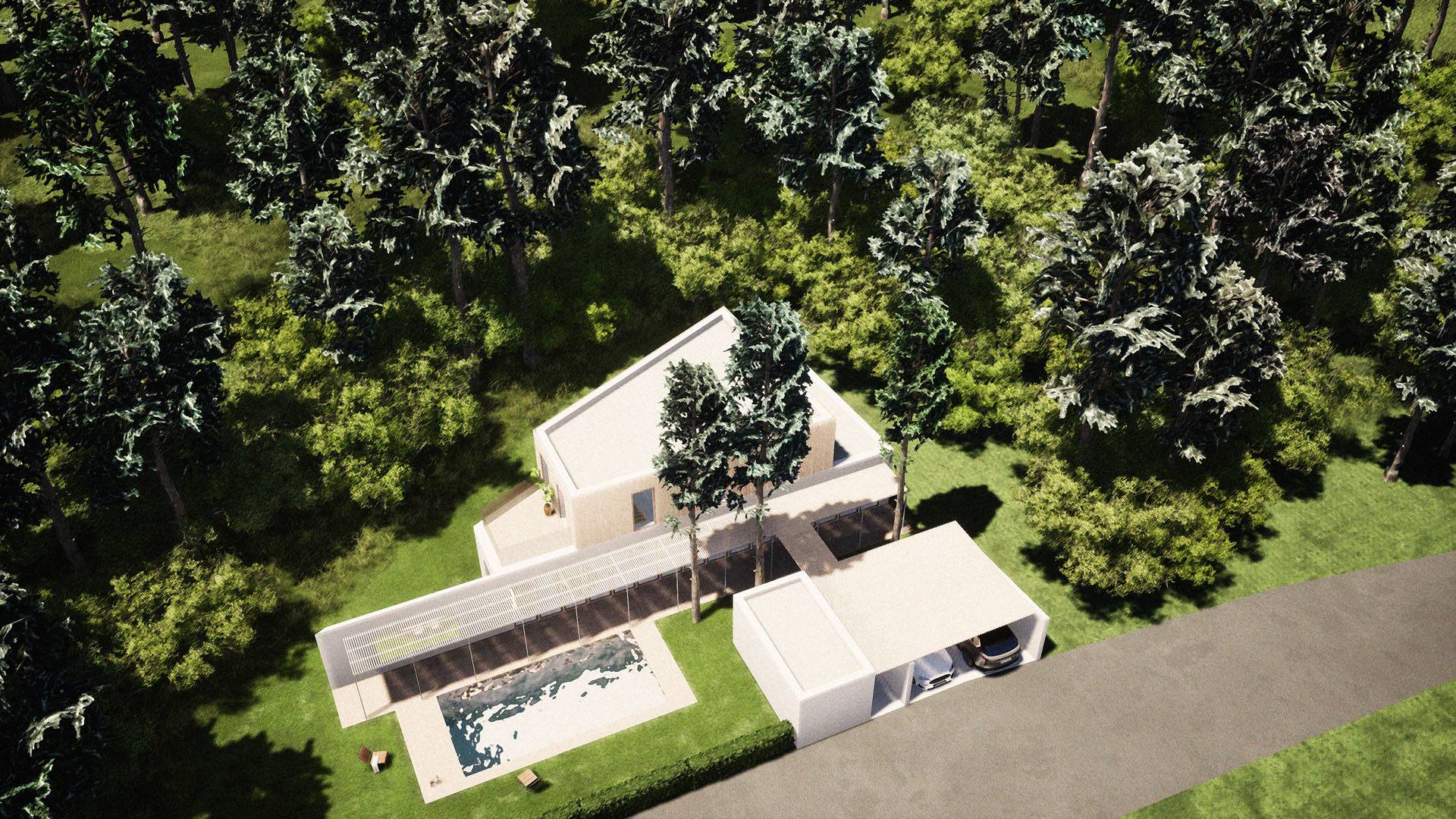 La maison est implantée au creux d’un terrain vallonné, sur une parcelle en triangle. Afin d’exploiter au mieux ces contraintes géométriques le garage et les locaux techniques sont placés en écran entre la rue et la villa. Ce déplacement permet de développer à rez-de-chaussée une longue promenade sous pergola logeant les espaces de vie intérieurs et extérieurs.