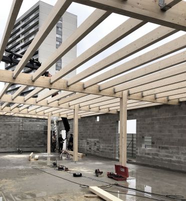 Mise en place de la charpente bois pour notre bâtiment d'extension de la maternelle Jean Jaurès au Bouscat [33].