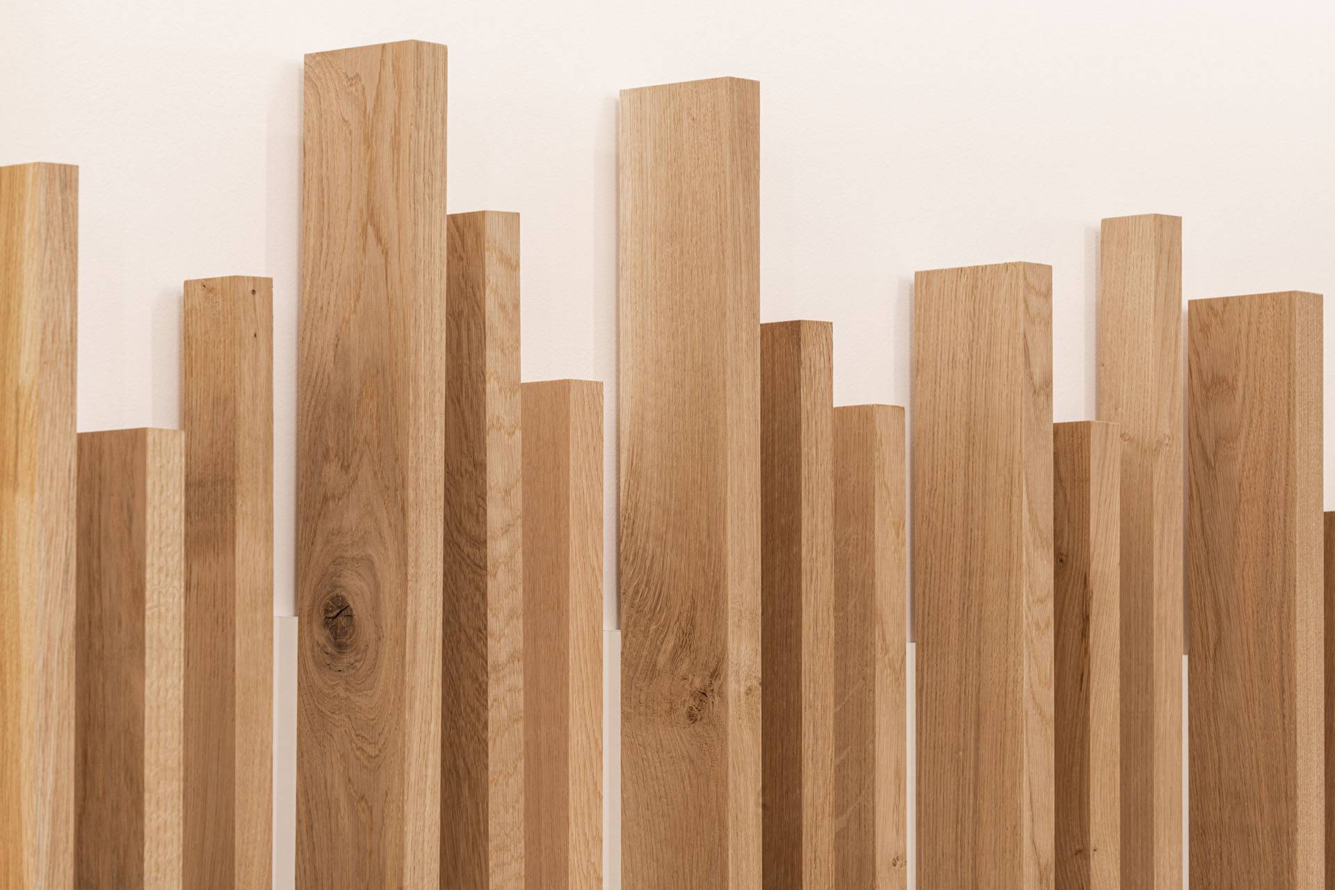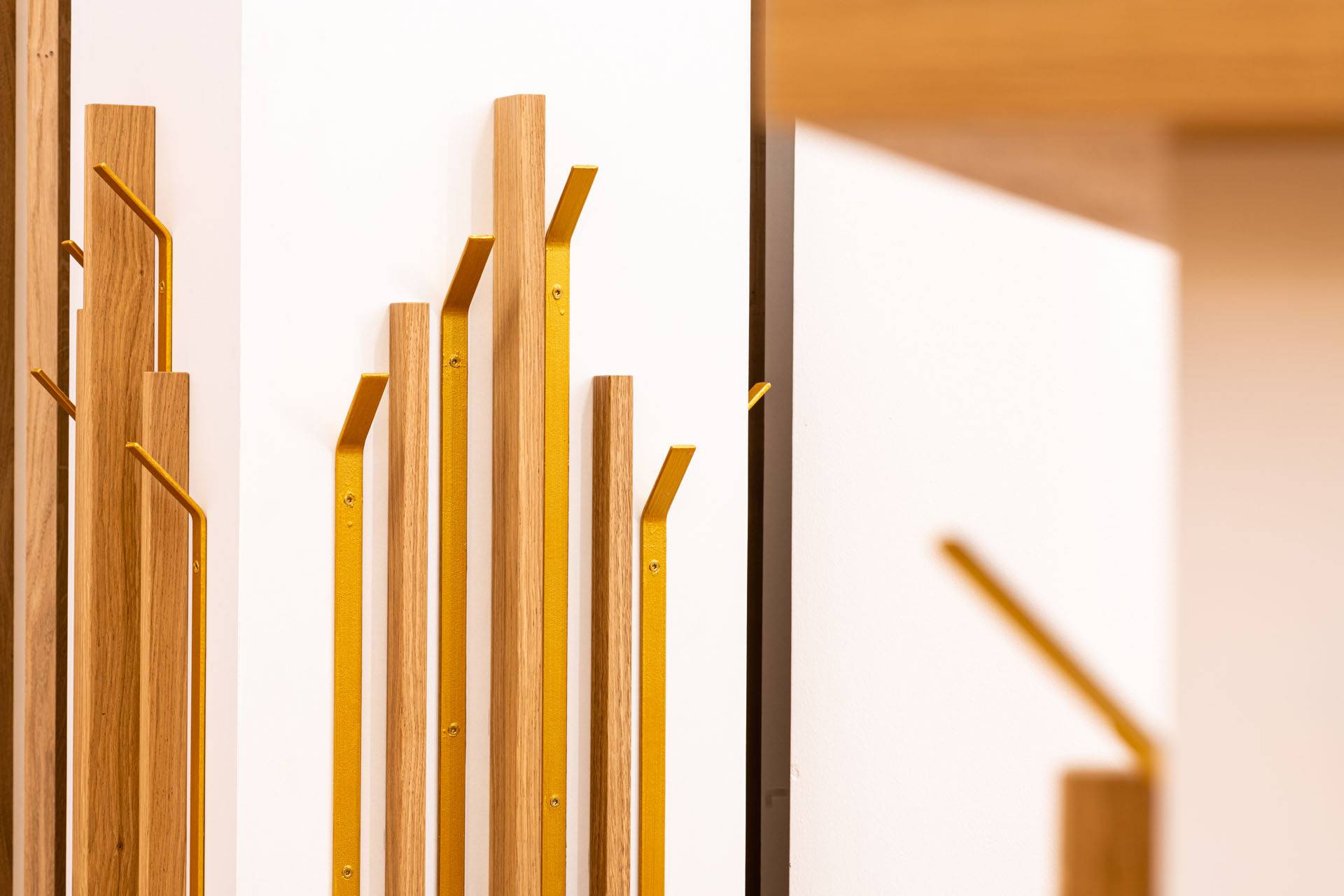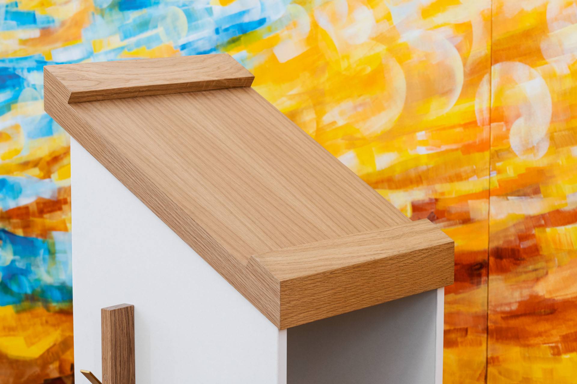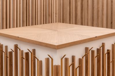 Les éléments de mobilier sont habillés de chêne brut, ainsi que l’ont été les murs intérieurs de la chapelle dans le cadre des travaux réalisés. Ces lames de bois sont placées en alternance avec des plaques de métal pliées et peintes dans des teintes or.