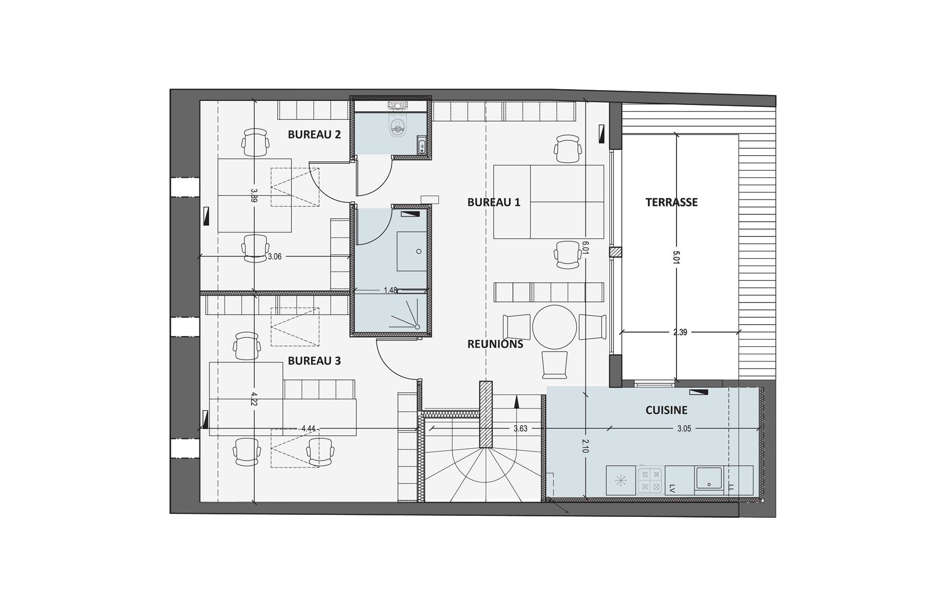 Le local comprend une cuisine, un coin réunion, des sanitaires, une salle de bains et une terrasse de 12m². Il est situé au deuxième et dernier étage d’une maison pierre surélevée.