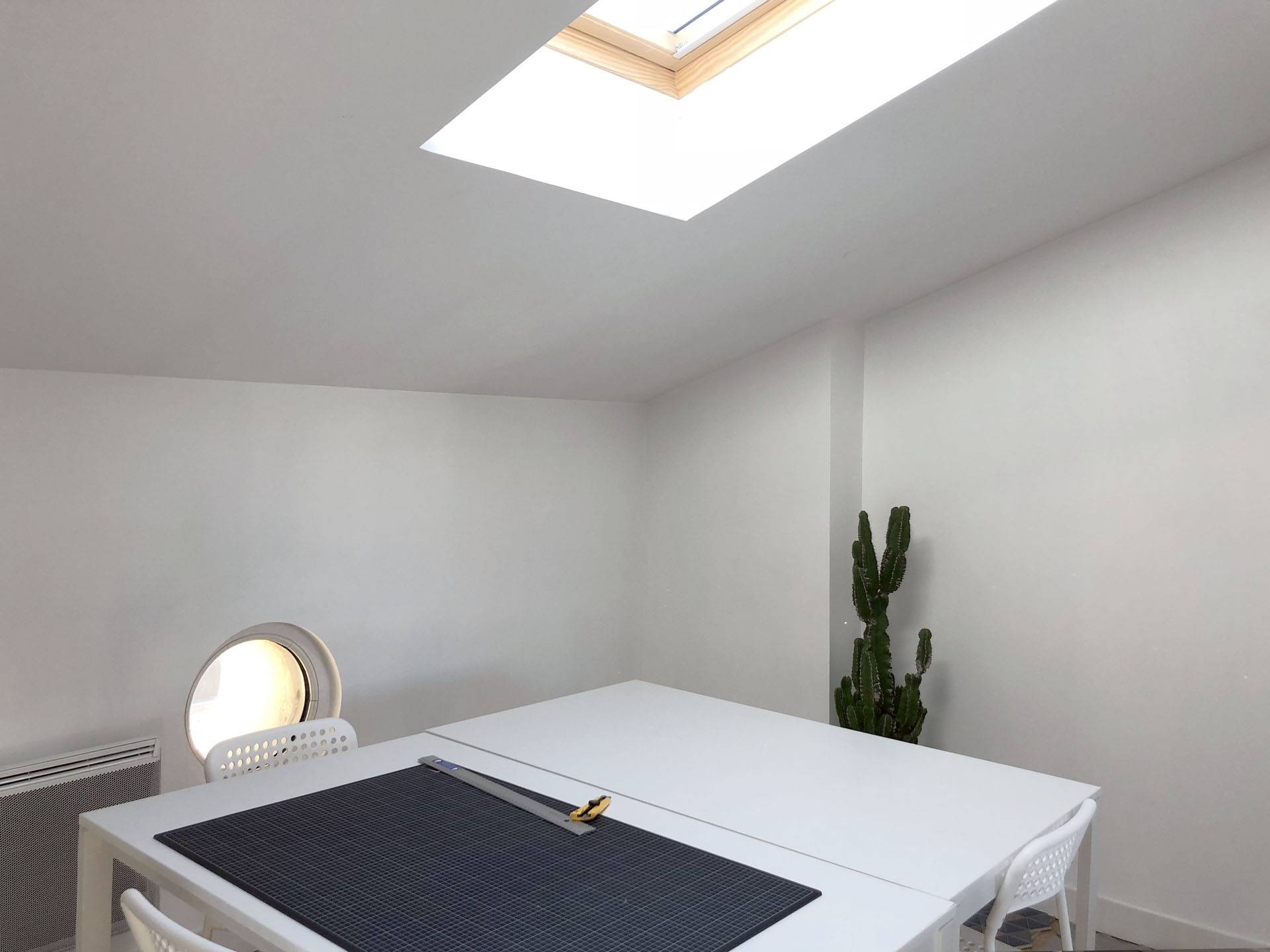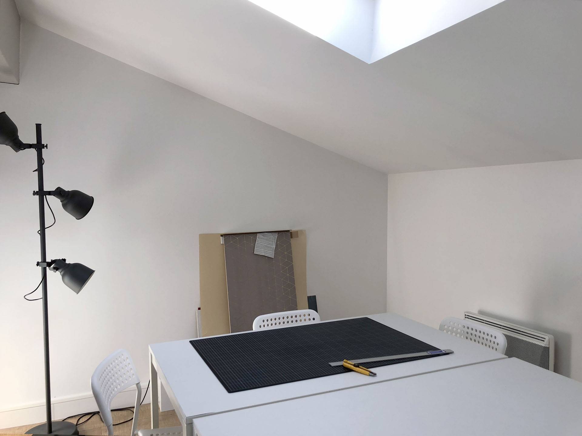 Un espace pour deux postes de travail [dans le Bureau 2] est disponible immédiatement : pièce sous plafond éclairée par un lanterneau et une fenêtre de toit.