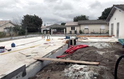 La dalle du rez-de-chaussée est coulée, en attente des charpentes et murs ossature bois.
